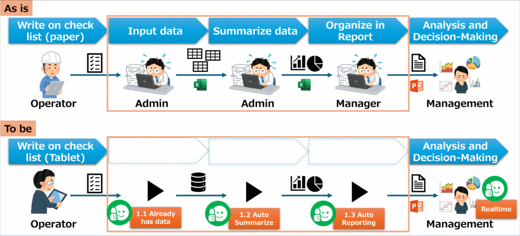業務をアプリ化する前とした後のイメージ図(作業工数と作業スピードが大幅に改善される)